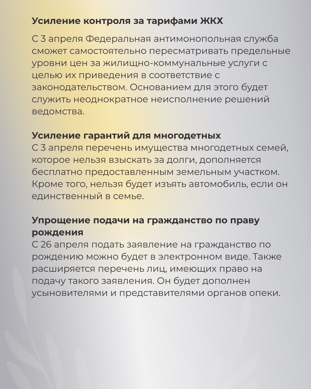 Усиление контроля за тарифами ЖКХ. С 3 апреля Федеральная антимонопольная служба сможет самостоятельно пересматривать предельные уровни цен за жилищно-коммунальные услуги с целью их приведения в соответствие с законодательством. Основанием для этого будет служить неоднократное неисполнение решений ведомства.