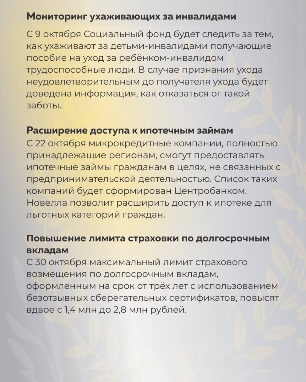 🔹Мониторинг ухаживающих за инвалидами. С 9 октября Социальный фонд будет следить за тем, как ухаживают за детьми-инвалидами получающие пособие на уход за ребёнком-инвалидом трудоспособные люди. В случае признания ухода неудовлетворительным до получателя ухода будет доведена информация, как отказаться от такой заботы.