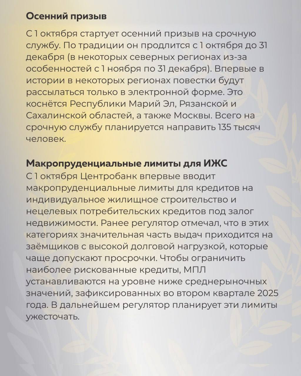 🔹Осенний призыв. С 1 октября стартует осенний призыв на срочную службу. По традиции он продлится с 1 октября до 31 декабря (в некоторых северных регионах из-за особенностей с 1 ноября по 31 декабря). Впервые в истории в некоторых регионах повестки будут рассылаться только в электронной форме. Это коснётся Республики Марий Эл, Рязанской и Сахалинской областей, а также Москвы. Всего на срочную службу планируется направить 135 тысяч человек.