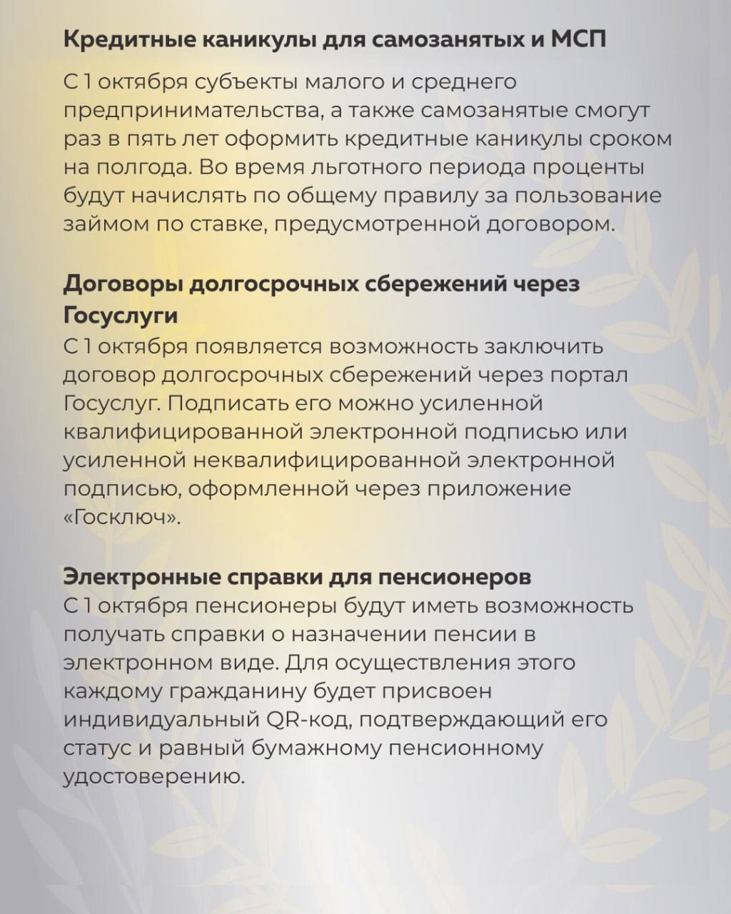 🔹Договоры долгосрочных сбережений через Госуслуги. С 1 октября появляется возможность заключить договор долгосрочных сбережений через портал Госуслуг. Подписать его можно усиленной квалифицированной электронной подписью или усиленной неквалифицированной электронной подписью, оформленной через приложение «Госключ».