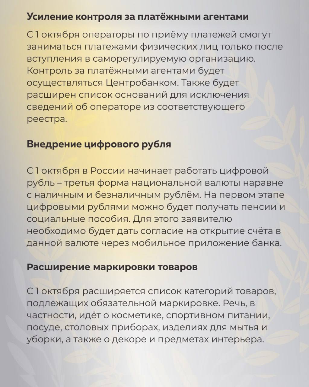 🔹Внедрение цифрового рубля. С 1 октября в России начинает работать цифровой рубль – третья форма национальной валюты наравне с наличным и безналичным рублём. На первом этапе цифровыми рублями можно будет получать пенсии и социальные пособия. Для этого заявителю необходимо будет дать согласие на открытие счёта в данной валюте через мобильное приложение банка.