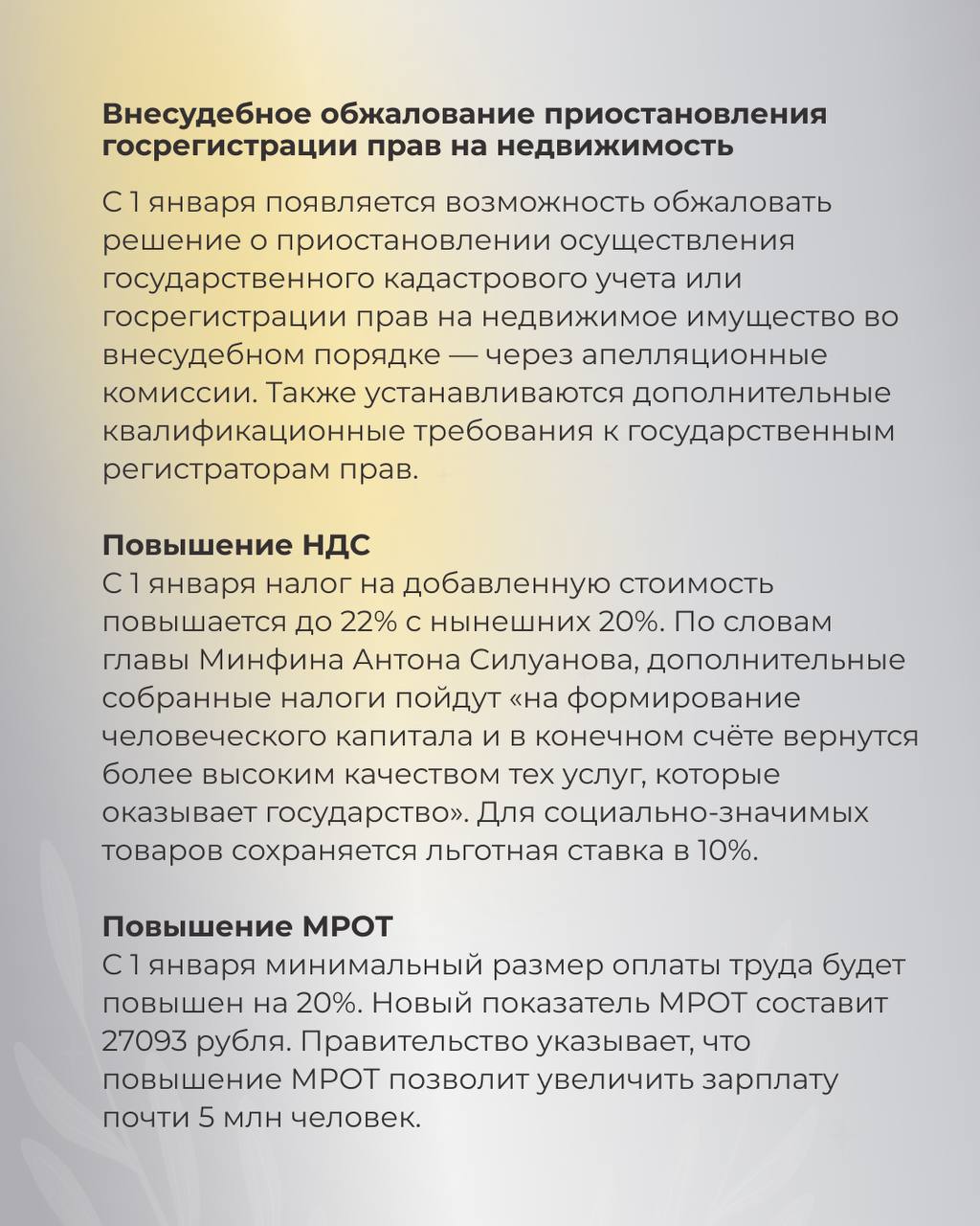 Повышение НДС. С 1 января налог на добавленную стоимость повышается до 22% с нынешних 20%. По словам главы Минфина Антона Силуанова, дополнительные собранные налоги пойдут «на формирование человеческого капитала и в конечном счёте вернутся более высоким качеством тех услуг, которые оказывает государство». Для социально-значимых товаров сохраняется льготная ставка в 10%.