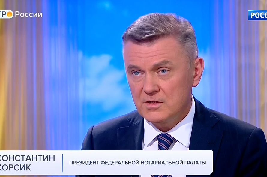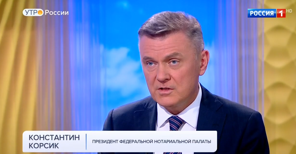 В студии программы «Утро России» обсудили законопроект, предусматривающий появление удаленных нотариальных действий и дистанционных сделок с участием двух нотариусов. Эти новеллы позволяют раскрыть позитивный потенциал цифровых технологий в жизни общества, сделать новые форматы гражданского оборота не только удобными, но и защищенными с помощью нотариуса. Именно нотариус всегда выступал гарантом законности первичного документа, на основе которого возникает право, и в условиях развития цифровой экономики нотариат уже готов предоставить самые современные сервисы. Президент Федеральной нотариальной палаты Константин Корсик пояснил, почему не все нотариальные действия можно совершать на расстоянии, как будет проходить идентификация человека, который решил обойтись без визита в контору нотариуса, и какими электронными сервисами можно воспользоваться уже сейчас.
