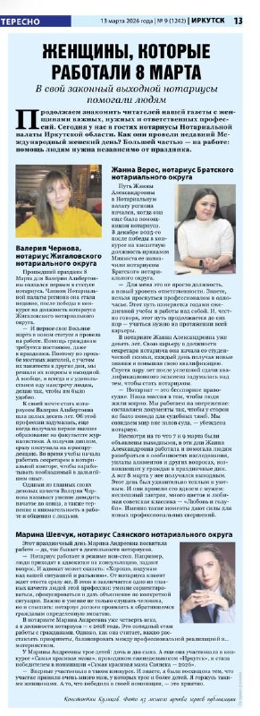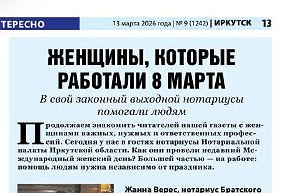 В свежем номере, посвященном Международному женскому дню, газета «Иркутск» рассказала о женщинах-нотариусах Иркутской области, которые и в праздничные дни помогали гражданам, выполняя свои профессиональные обязанности